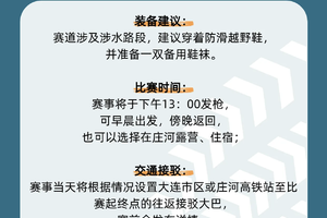 2、 选手在比赛中出现紧急情况急需救援时,请拔打参赛号码布正面的赛会联系电话,与指挥中心取得联系,并原地等待救援人员到达。赛事鼓励参赛选手互助,当发现有其他选手需要援助时,也请尽快联系指挥中心,或最近的救援人员。