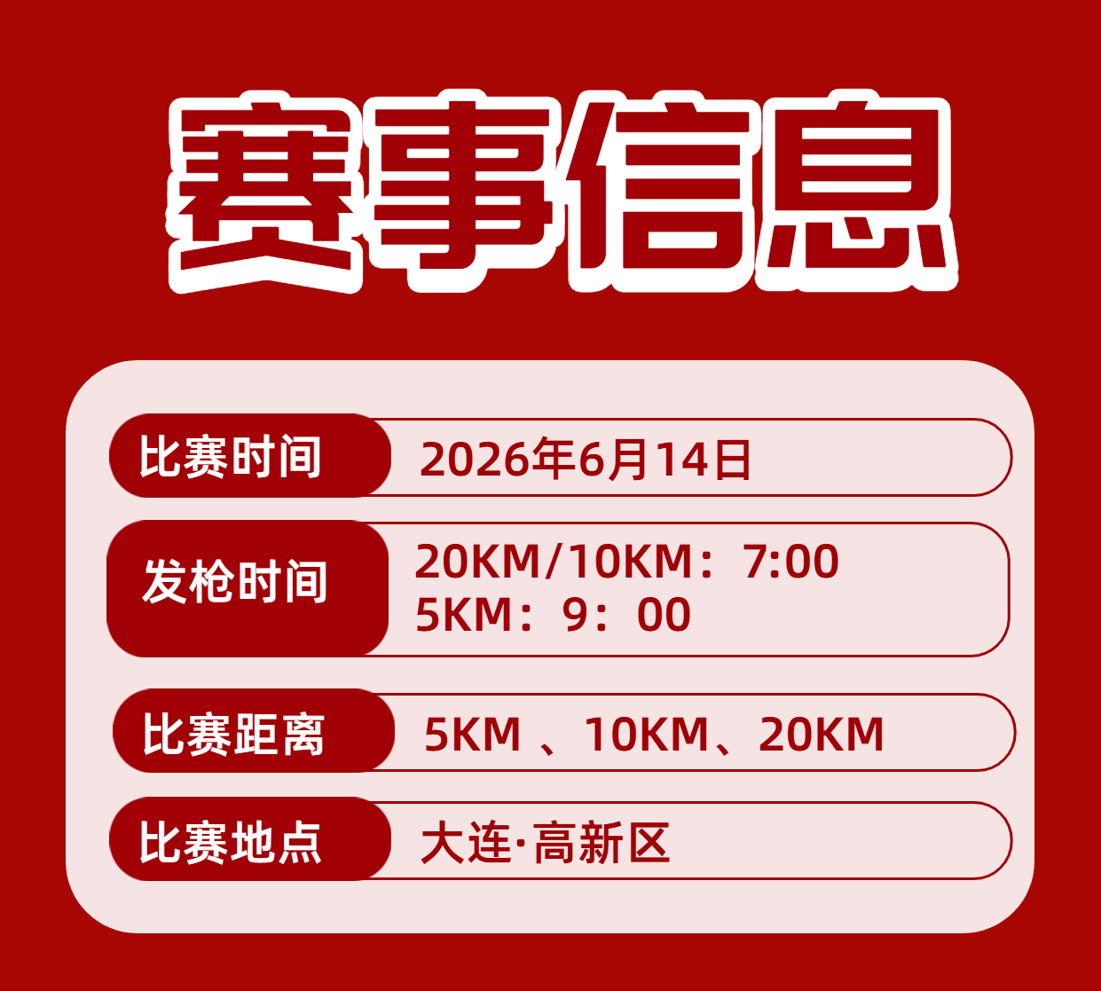 本次比赛20KM组、10KM组将于6月14日 7:00发令,5KM青少年组将于6月14日 9:00发令,请各参赛选手根据组别发令时间,在起点处等待比赛发令。