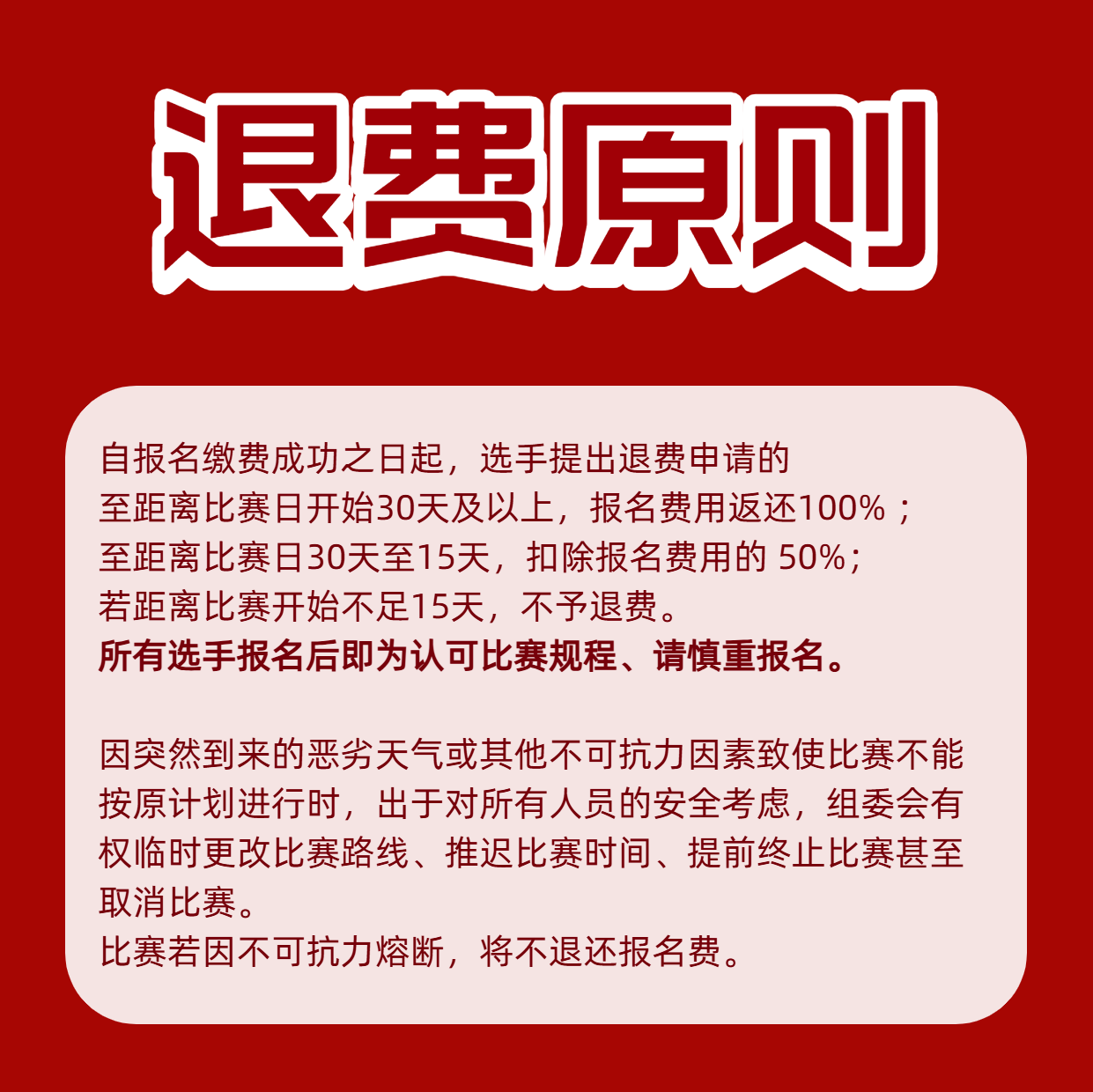 12、因突然到来的恶劣天气或其他不可抗力因素致使比赛不能按原计划进行时,出于对所有人员的安全考虑,赛事主办方有权临时更改比赛路线、推迟比赛时间、提前终止比赛甚至取消比赛。无论采取何种决定,报名费均不予退还,敬请所有选手悉知和理解。