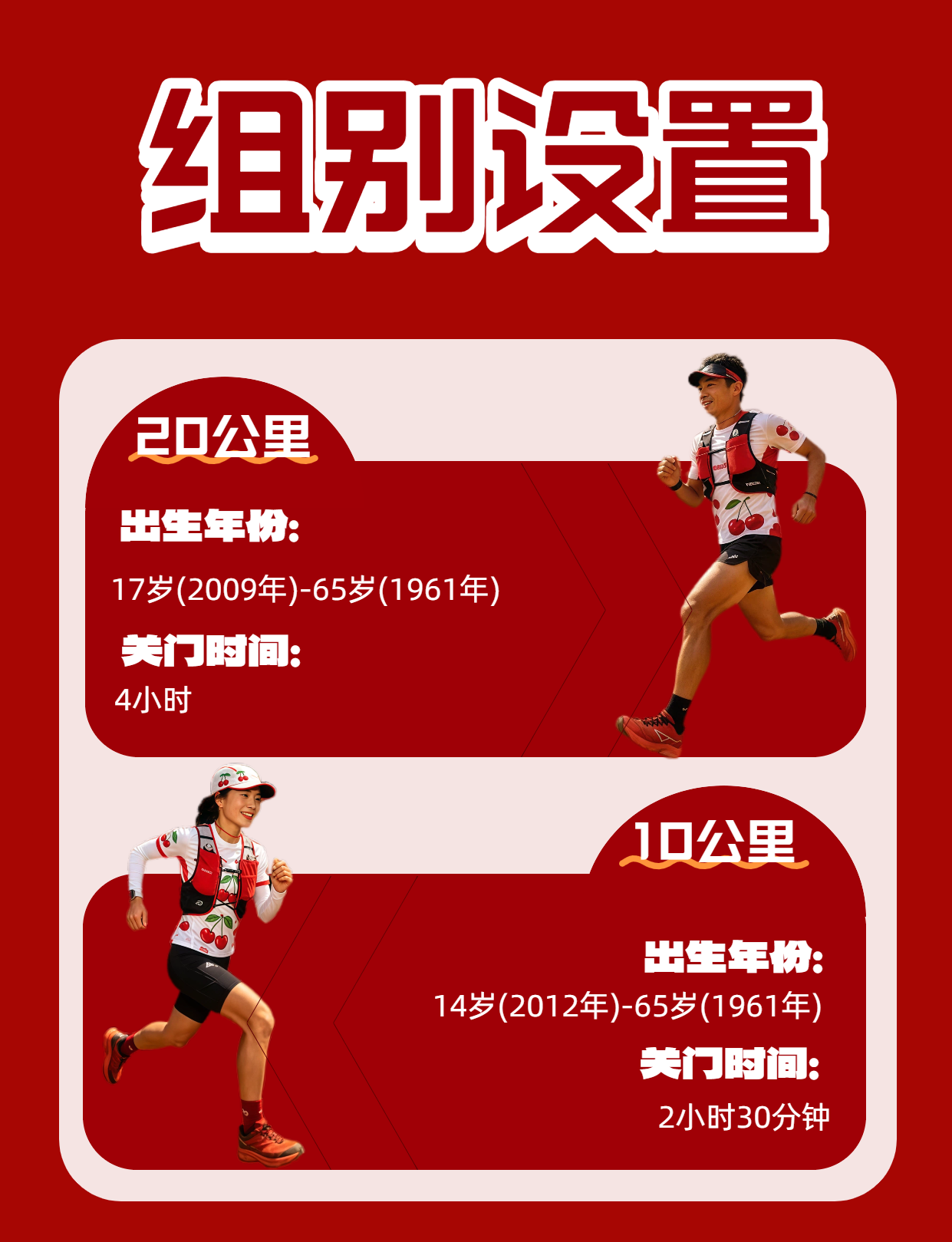20KM组参赛选手:17岁以上(2009年12月31日前出生)65岁以下(1961年12月31日后出生)