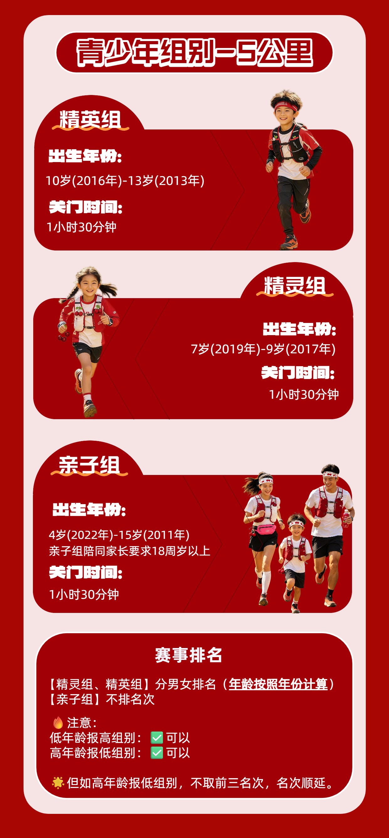 ·亲子组:4周岁(2022年)起,需在成年人(18周岁以上)陪同下完赛;