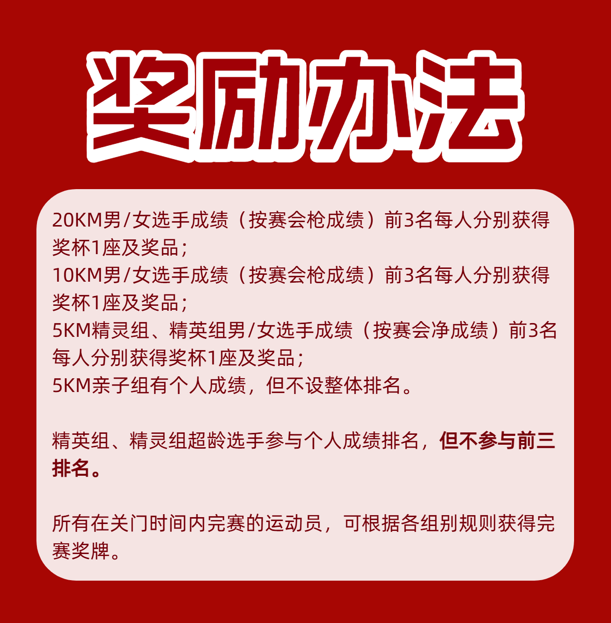 所有在关门时间内完赛的运动员,可根据各组别规则获得完赛奖牌;