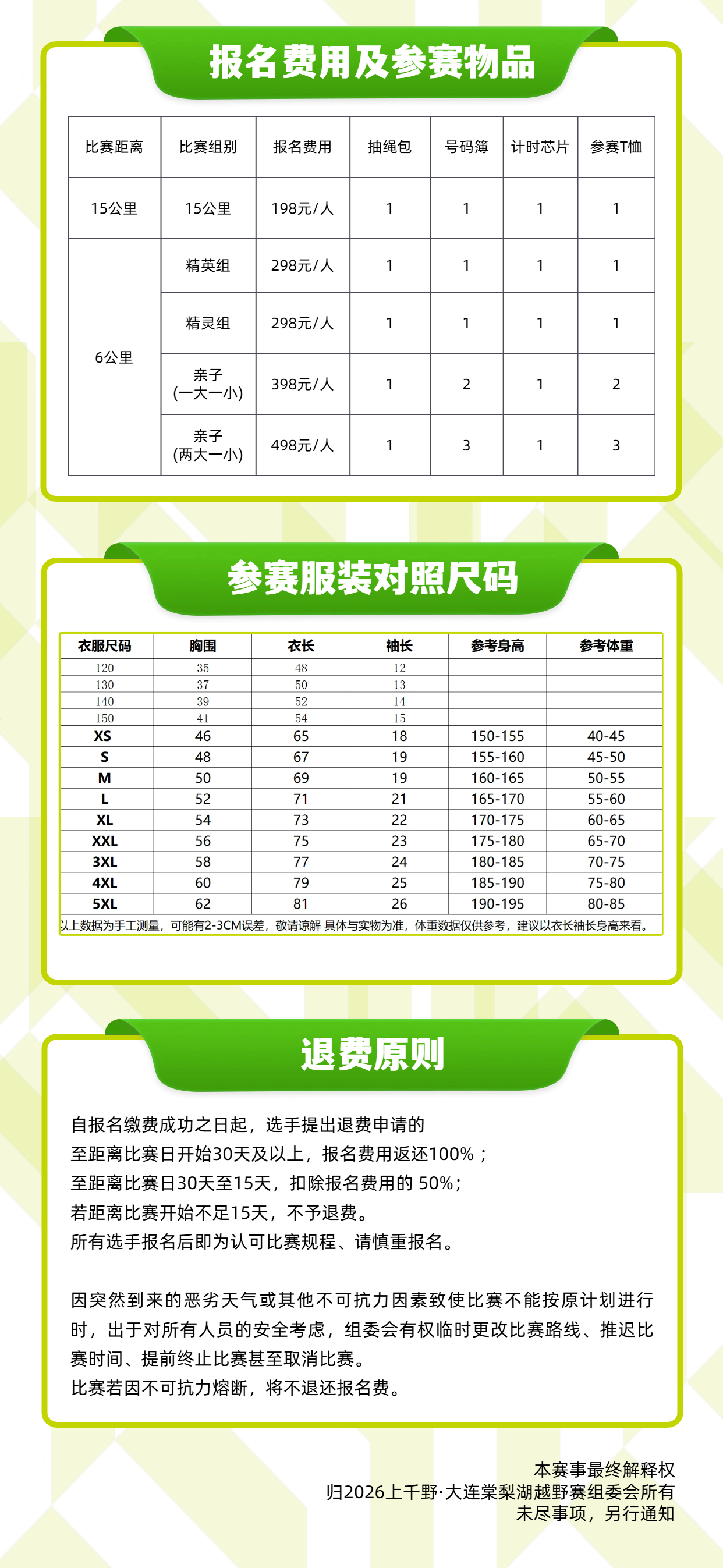 4、因突然到来的恶劣天气或其他不可抗力因素致使比赛不能按原计划进行时,出于对所有人员的安全考虑,组委会有权临时更改比赛路线、推迟比赛时间、提前终止比赛甚至取消比赛。比赛若因不可抗力熔断,将不退还报名费;